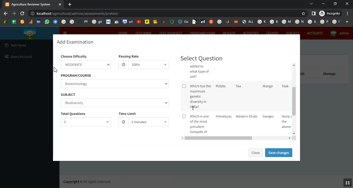 Agriculture students and professionals preparing for certification or competitive exams require a systematic and interactive platform to practice and review subject-specific questions. This project focuses on developing an Agriculture Exam Reviewer in PHP, designed to help users review and test their knowledge in various agricultural topics. The system allows administrators to add questions, categorize them by subject, and manage user accounts, while students can take quizzes, review their answers, and track progress. Using PHP and a MySQL database, the application delivers a secure, user-friendly interface to improve learning outcomes and exam readiness.