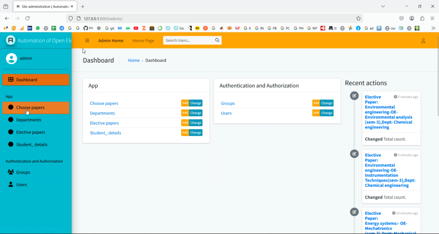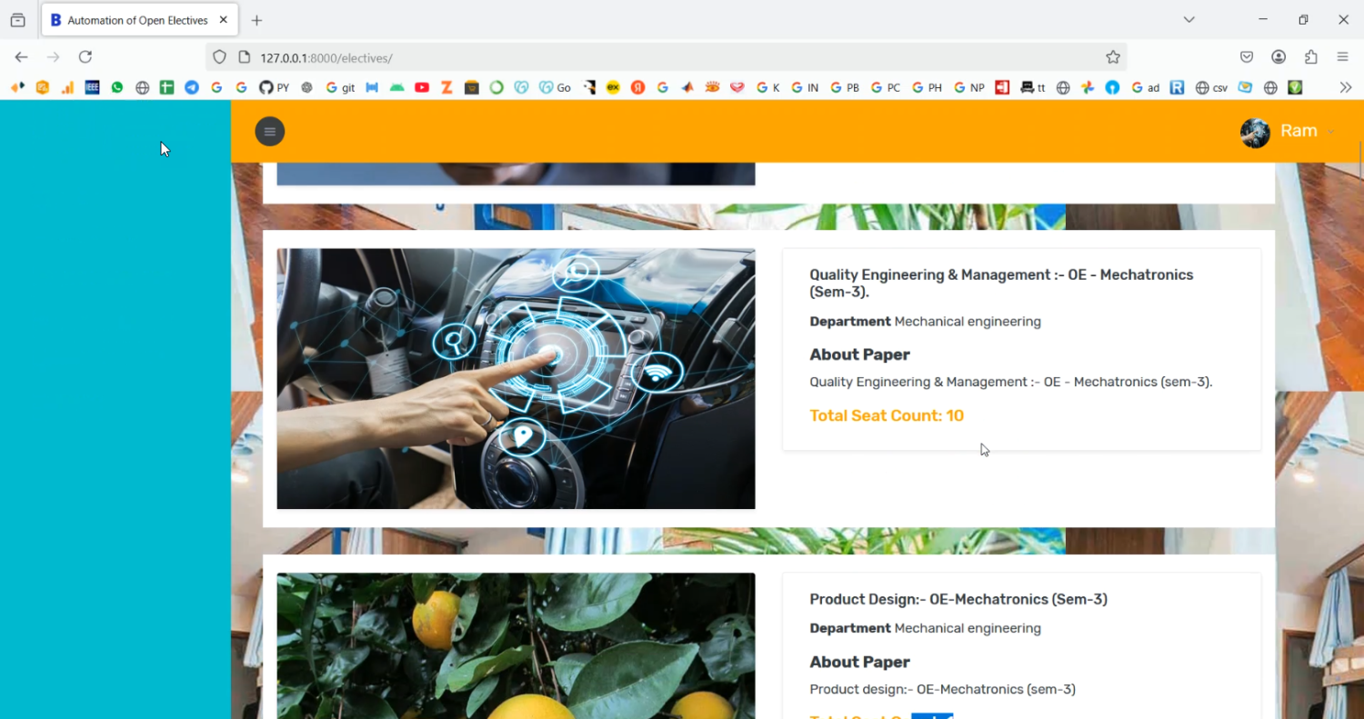 The proposed system introduces a Django-based automated elective management platform that streamlines the entire process. Students can log in, browse elective subjects, check seat availability, and register instantly. The system enforces seat limits automatically and provides real-time confirmation of allocation. Administrators and faculty can add/edit electives, define seat capacities, and monitor student enrollments through dashboards and reports. Additional features such as student preference ranking, automated conflict resolution, email/SMS notifications, and report generation enhance usability. Compared to the existing system, the proposed solution ensures accuracy, transparency, fairness, and significant time savings, while also supporting scalability for large institutions.