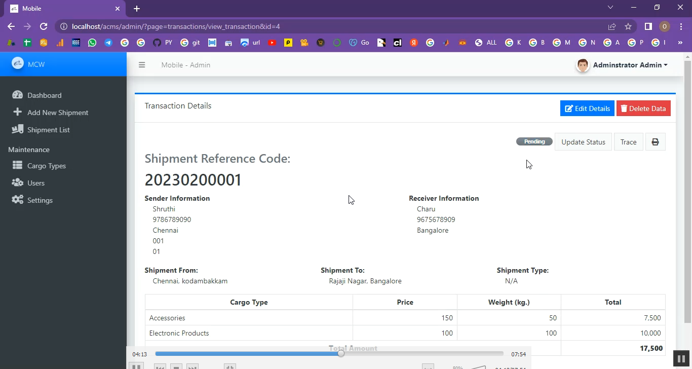 The Cargo Shipment Management System in PHP is designed to digitize and streamline the process of handling cargo shipments for logistics companies, shippers, and customers. This system enables administrators to manage shipment details, track cargo movements, generate invoices, and handle customer requests efficiently. Customers can view shipment status, request pickups, and receive real-time updates on their consignments. Built using PHP and MySQL, it ensures secure data handling, real-time tracking, and a user-friendly interface for both administrators and clients.