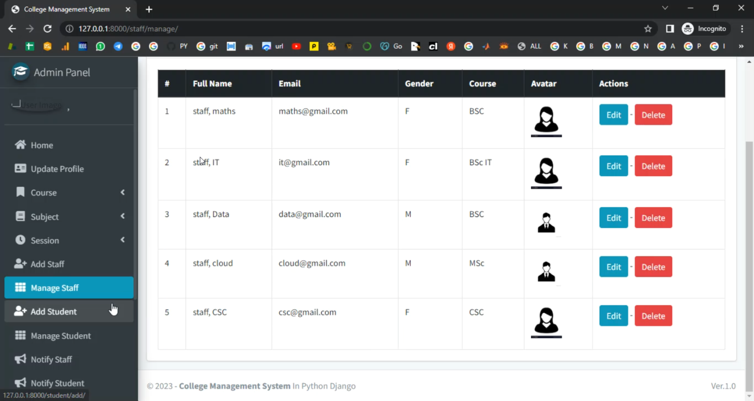 A College Management System is an essential tool for modern educational institutions to handle academic and administrative tasks efficiently. Traditional manual systems are prone to delays, errors, and mismanagement of student records, faculty data, and administrative workflows. The College Management System in Django Python provides a secure and scalable web application that allows administrators, faculty, and students to interact through a centralized platform. Core functionalities include student registration, faculty management, course allocation, attendance tracking, timetable scheduling, examination management, result publishing, and fee management. Built with Django, the system ensures role-based access, secure authentication, and real-time data processing, thereby reducing paperwork, improving communication, and streamlining overall college operations.
