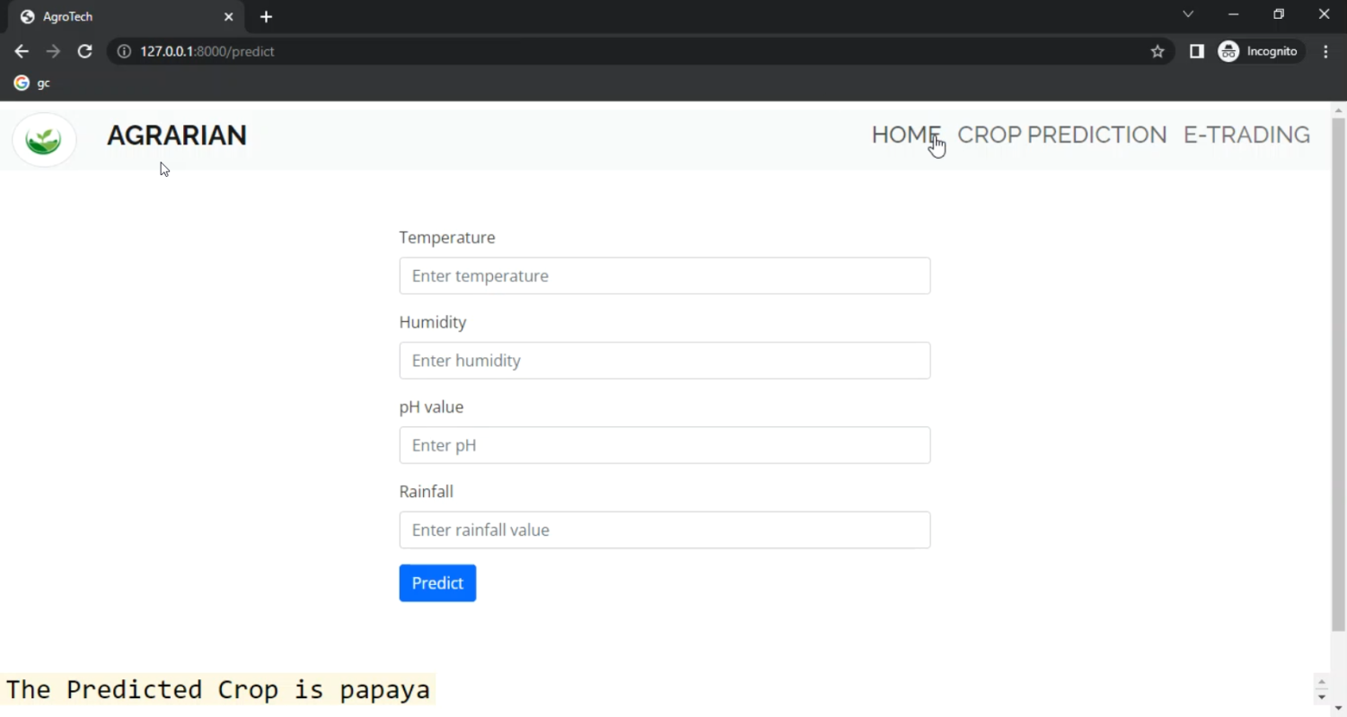 The proposed Django-based Crop Prediction System addresses these limitations by using machine learning models (e.g., Decision Tree, Random Forest, or Naïve Bayes) trained on agricultural datasets. Farmers enter parameters such as soil nutrients (NPK values), pH, temperature, and rainfall, and the system predicts the most suitable crop for that region. The portal provides a farmer-friendly interface where users can view crop suggestions, fertilizer recommendations, and expected yield estimates. Administrators can update datasets and models to improve accuracy over time. Compared to the existing manual system, this approach ensures personalized, accurate, and timely crop recommendations, helping farmers achieve better productivity and profitability.