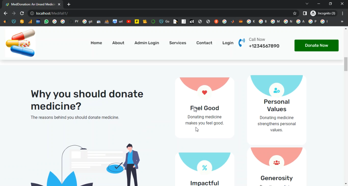 The proposed Online Medicine Donation System automates the entire donation process using PHP and MySQL. Donors can register, upload details about medicines (name, expiry date, quantity, and condition), and schedule pickup or drop-off. Recipients (NGOs, hospitals, or individuals) can log in to browse available medicines, request donations, and track approvals. Administrators can verify medicines, manage user authenticity, approve or reject donation requests, and maintain a secure, centralized record of all transactions. The system also generates reports on donated medicines, recipients, and overall impact. By providing a structured, secure, and user-friendly platform, the system increases transparency, minimizes medicine wastage, and ensures that essential medicines reach those in need on time.