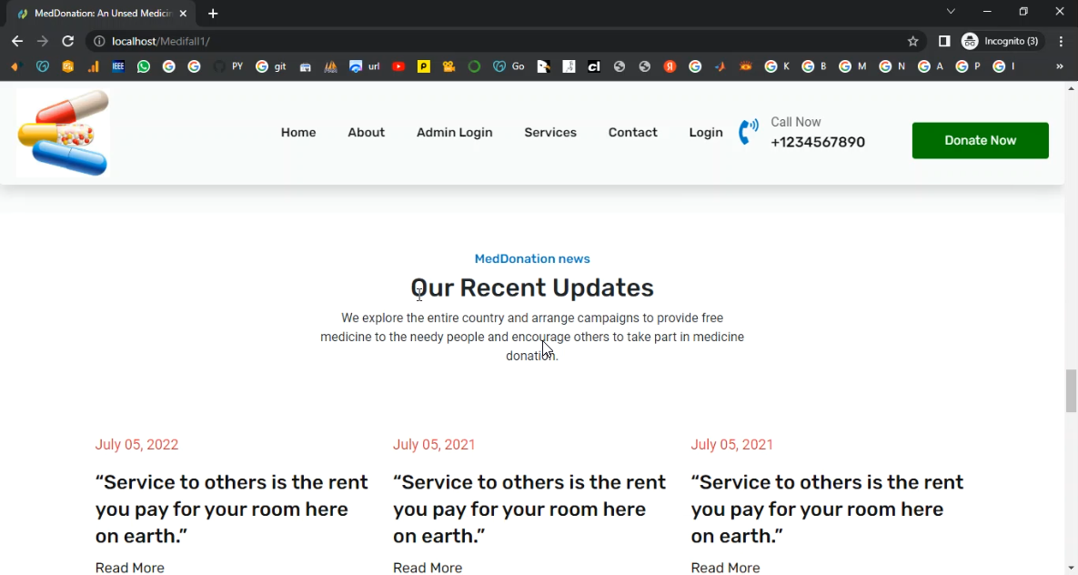 The Online Medicine Donation System is a PHP–MySQL based web application designed to facilitate the donation of unused or surplus medicines to NGOs, hospitals, or individuals in need. The system enables donors to register, list available medicines, and schedule donations, while recipients can browse medicines, request them, and track delivery. Administrators can verify donor and recipient details, manage donations, and generate reports. By digitizing the donation process, the system helps reduce medicine wastage, improves public health support, and makes the distribution process transparent and efficient.