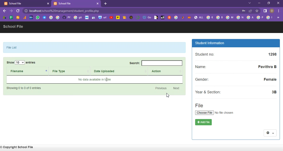 The proposed School Student Record File Management System in PHP digitizes all student-related records and organizes them in a centralized database. Administrators can add, update, and search student records instantly. Teachers can view or update academic performance, attendance, and disciplinary details. Parents and students can securely access relevant information, such as attendance or report cards. The system includes secure login credentials, automated backups, and reporting tools for data analytics. By providing a secure, centralized, and user-friendly platform, the system saves time, prevents data loss, improves accuracy, and ensures streamlined management of student information.