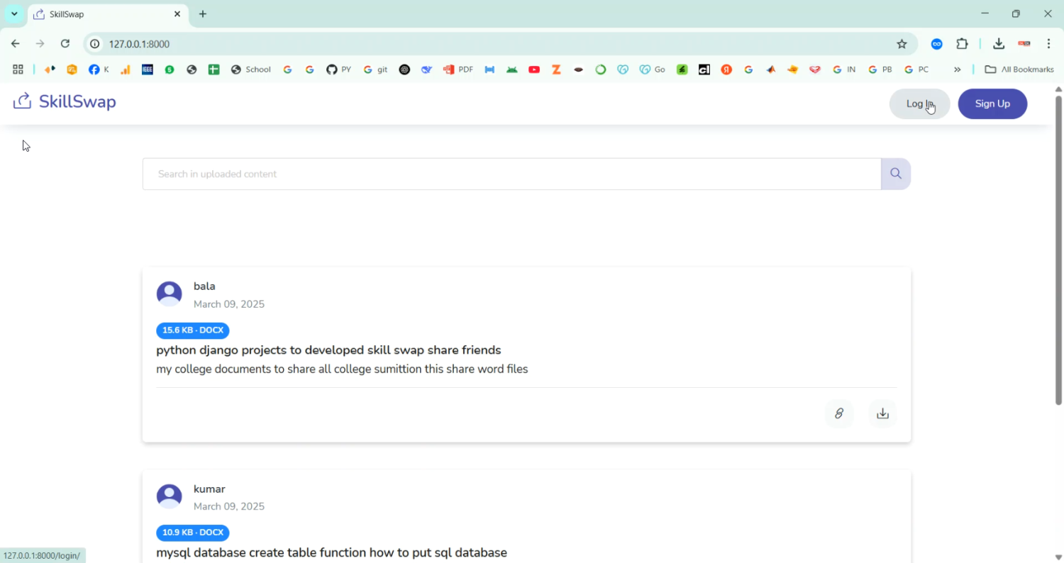 The proposed SkillSwap Platform in Django Python provides a centralized platform where users can create profiles, list their skills, and browse available skills offered by peers. Users can send requests to exchange skills, schedule sessions, and rate or review each other after completion. Administrators can monitor user activity, verify profiles, and manage disputes. Additional features like chat integration, calendar scheduling, and notifications enhance user experience. By enabling peer-to-peer skill exchange, the system promotes community learning, reduces learning costs, and encourages knowledge sharing in a flexible and interactive environment