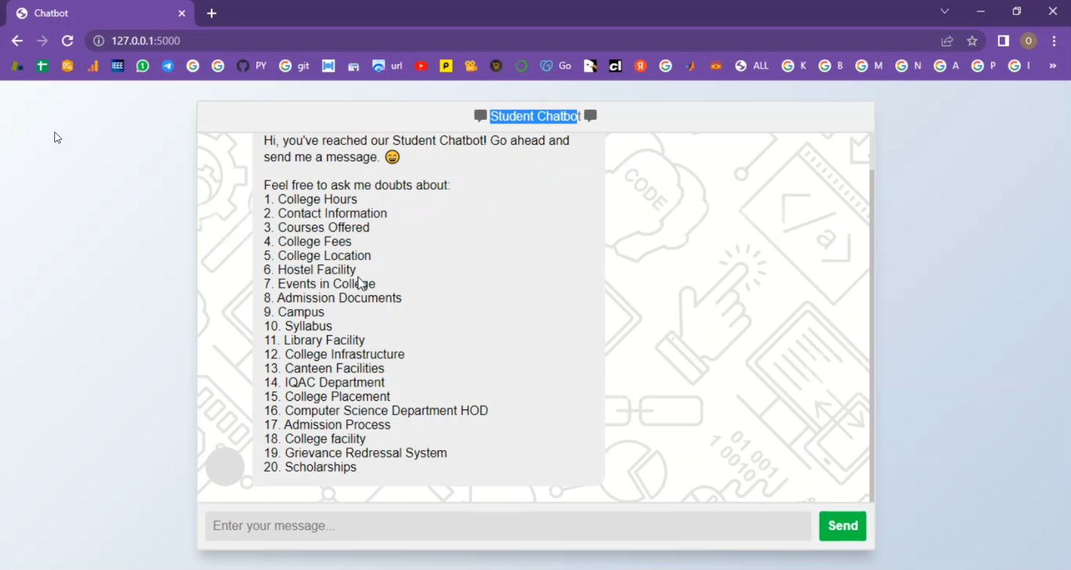 The proposed Student Chatbot in Django Python provides a centralized platform where students can interact with a chatbot integrated into the institution’s website or portal. Administrators can add or update question-answer pairs, train the chatbot to respond to new queries, and analyze query logs to improve services. Features like natural language processing (NLP), multi-language support, and integration with student information systems can further enhance the chatbot. By digitizing student support, the system improves communication, reduces staff workload, and ensures instant, accurate responses to student queries.