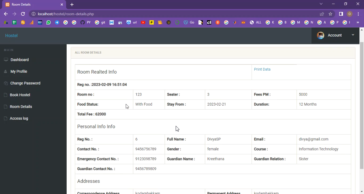 The proposed Student Hostel Room Allocation System in PHP digitizes and streamlines the entire hostel room allocation process. Administrators can manage hostel buildings, room details, and student records from a single dashboard. Students can submit online applications for rooms, select preferences (such as room type or sharing options), and receive instant confirmation of allocation. The system prevents duplicate allocations, tracks vacancies in real time, and generates reports for hostel occupancy. By centralizing and automating the process, the system saves time, reduces errors, and improves transparency between hostel administration and students.