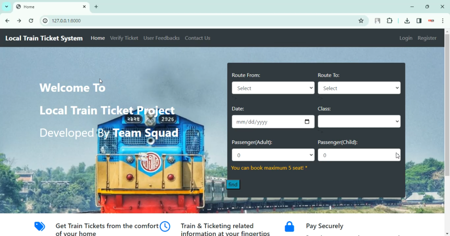 Booking train tickets online has become an essential service for passengers to plan and manage their travel easily. This project focuses on developing a Train Ticket Booking System in Django Python, designed to allow users to search for trains, check seat availability, book tickets, and view booking history in a centralized and secure platform. The system enables administrators to manage train schedules, routes, fares, and seat availability, while users can create accounts, reserve tickets, and receive digital confirmations. Built using Django with a PostgreSQL/MySQL database, the platform ensures secure authentication, seamless transactions, and a user-friendly interface.