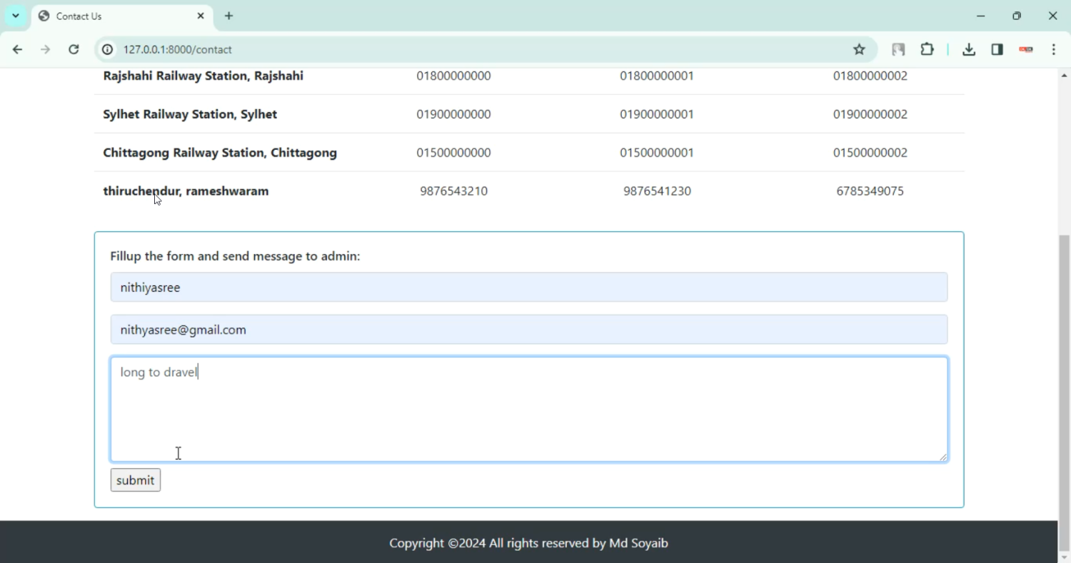 The proposed Train Ticket Booking System in Django Python provides a centralized platform where passengers can search trains based on source, destination, and date, check seat availability in real time, and make bookings instantly. Administrators can manage train details, seat quotas, fares, and cancellation policies. Features such as automated ticket generation, booking notifications via email/SMS, payment gateway integration, refund handling, and printable e-tickets enhance usability. By digitizing train ticket booking, the system improves accessibility, reduces manual workload, and offers a seamless travel planning experience to passengers.