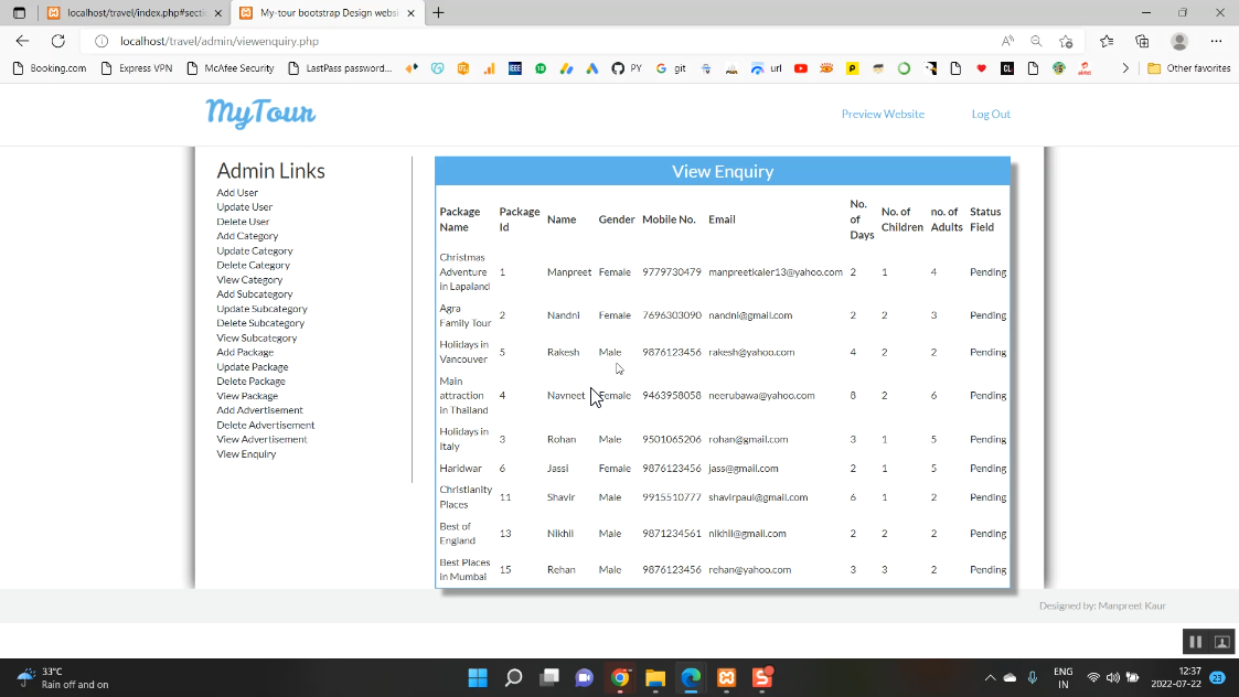 The proposed Travel Management System in PHP digitizes all travel-related operations. Administrators or travel agents can add trips, manage itineraries, track bookings, handle payments, and update trip statuses. Customers can browse available trips, book travel packages, make online payments, and receive instant booking confirmations. The system also generates reports for bookings, revenue, and travel trends, and sends notifications for upcoming trips or payment reminders. By centralizing travel management, the system ensures accurate record-keeping, faster processing, and improved transparency between administrators and travelers.