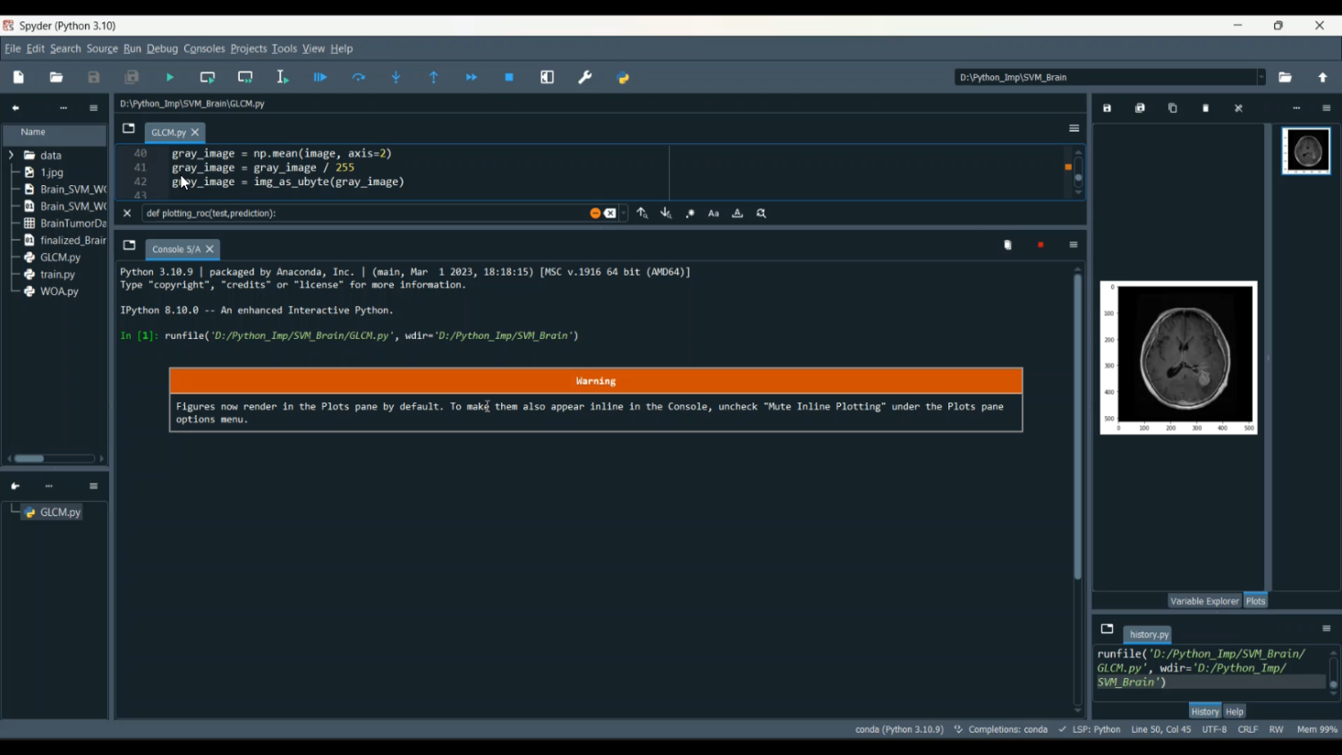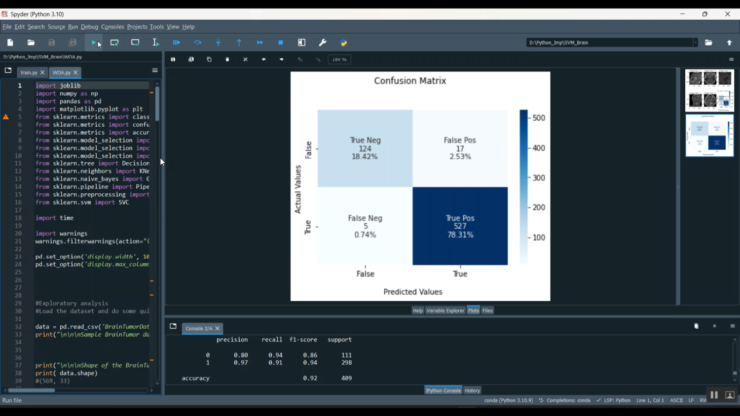 Brain tumor detection is a critical task in medical imaging, as early diagnosis significantly improves treatment outcomes and patient survival rates. Traditional manual methods of analyzing MRI scans are time-consuming and prone to errors due to the complexity of brain structures. This project, Brain SVM WOA Tumor Detection in Python, proposes an intelligent framework that combines Support Vector Machine (SVM) for classification with Whale Optimization Algorithm (WOA) for feature selection and optimization. The system processes MRI brain images, extracts significant features using image processing techniques (such as Gray Level Co-occurrence Matrix (GLCM), texture analysis, and shape features), and applies WOA to select the most relevant features for classification. The optimized features are then classified using an SVM model to determine whether a tumor is present. Implemented in Python using OpenCV, NumPy, Scikit-learn, and optimization libraries, this system ensures higher accuracy, reduced computation time, and robustness compared to traditional methods.