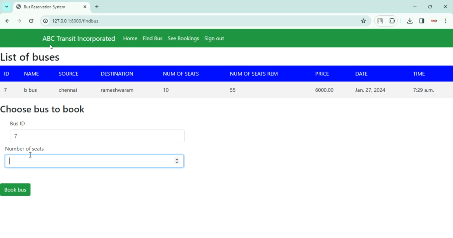 The proposed Django-based Bus Reservation System automates ticket booking and schedule management. Passengers can sign up, log in, view bus schedules, check available seats, reserve tickets, cancel reservations, and get confirmation via email/SMS. Administrators can add or edit bus details, define routes, set timings, monitor seat occupancy, and generate reports for better management. Features such as role-based dashboards, secure authentication, payment integration, and real-time availability updates make the system reliable and user-friendly. Compared to manual methods, this system ensures 24/7 accessibility, reduced booking errors, transparent seat availability, streamlined administration, and enhanced customer satisfaction.