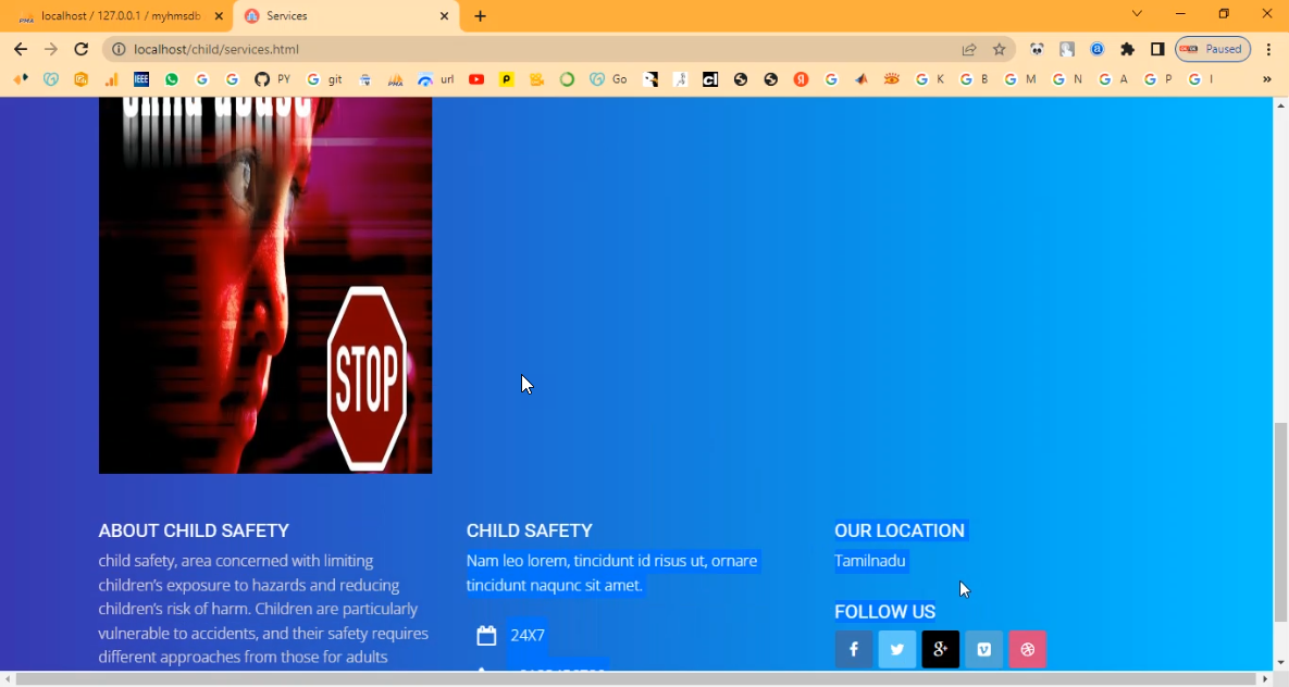 The Child Safety System in PHP is designed to enhance the safety and monitoring of children by providing a centralized platform for parents, guardians, and authorities to manage and track child-related safety information. This system allows administrators to maintain child profiles, track emergency contacts, and report or monitor safety-related incidents. Built using PHP and MySQL, it provides secure data management, real-time notifications, and an intuitive interface to help ensure children’s well-being.