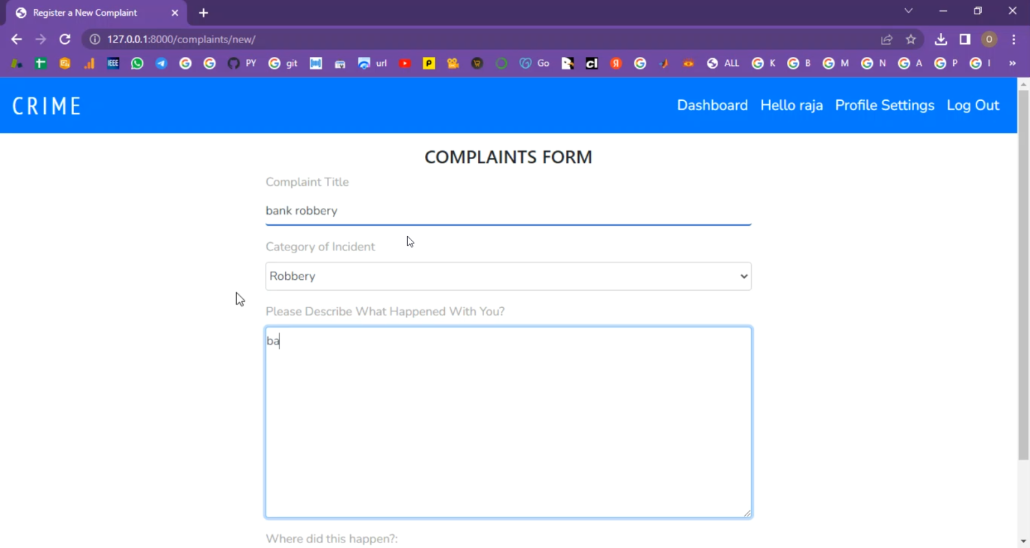 The proposed Django-based Crime Information System addresses these issues by providing a centralized and digital platform for crime reporting and management. Citizens can register complaints online, upload evidence (images, documents), and track the status of their cases. Administrators and police officers can manage records of criminals, categorize crimes (theft, assault, cybercrime, etc.), and update case progress. The system includes real-time notifications, secure login, role-based dashboards, and advanced search/filter options. Additionally, crime data can be analyzed to identify patterns, generate statistical reports, and predict high-crime zones. Compared to the existing system, this solution ensures efficiency, accuracy, transparency, and scalability, while fostering better collaboration between citizens and law enforcement.