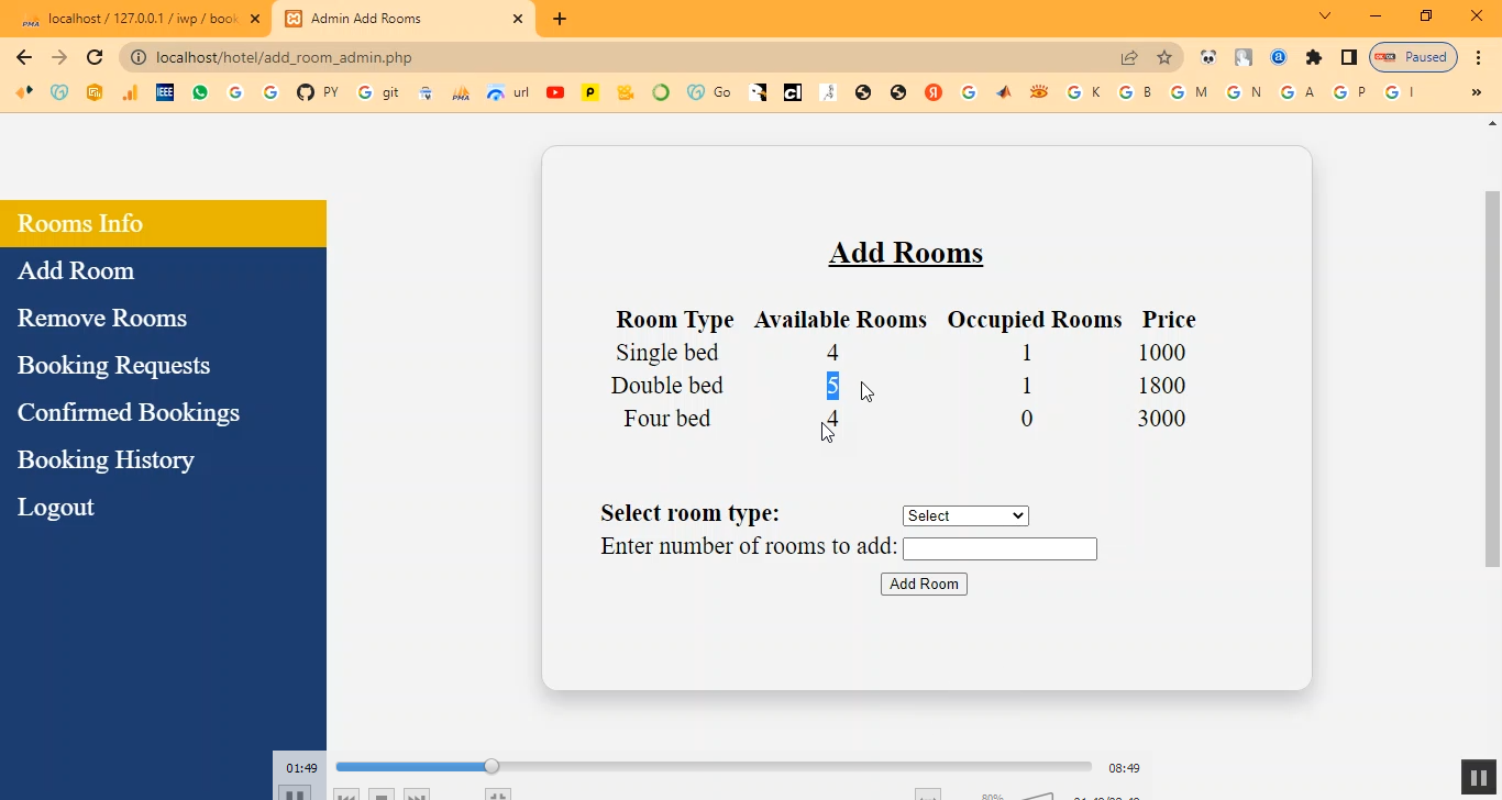 The Hotel Room Booking System is a PHP–MySQL based web application developed to automate the process of booking hotel rooms online. This system allows customers to view available rooms, check prices and amenities, and make reservations instantly. Administrators can manage rooms, pricing, availability, customer records, and payments from a centralized dashboard. By digitizing the room booking process, the system improves efficiency, reduces manual errors, and enhances customer satisfaction through faster and more transparent reservations.