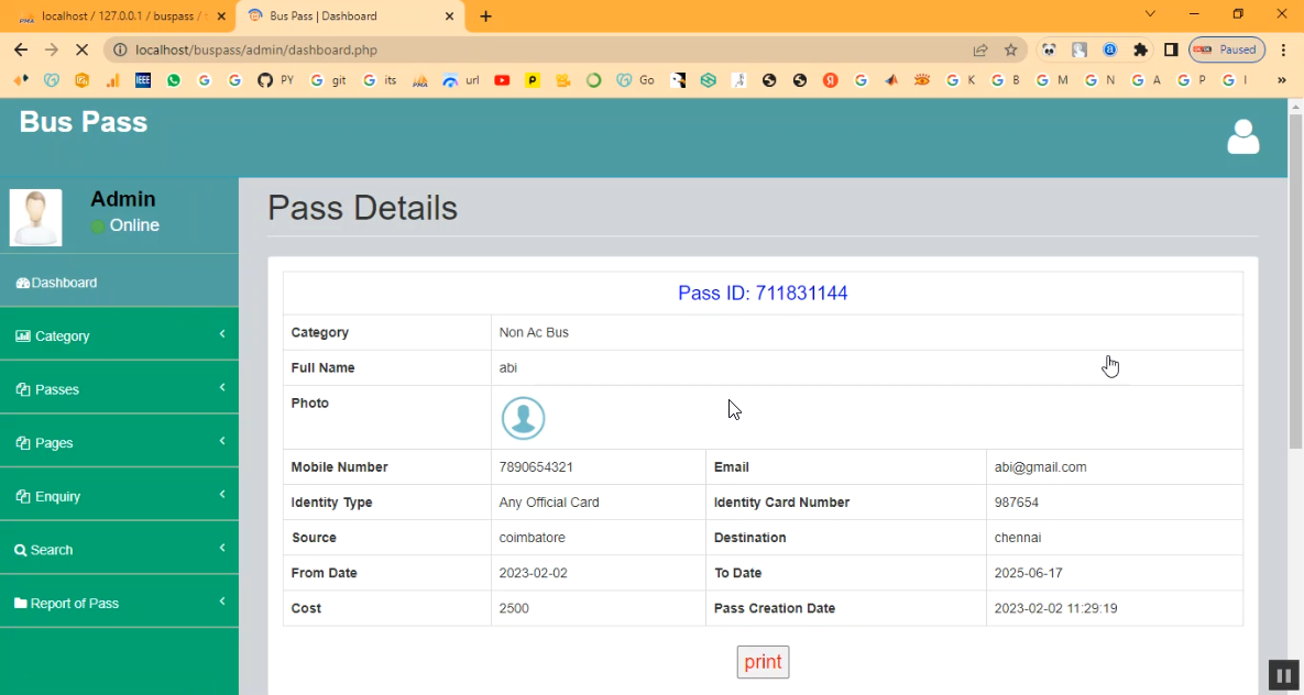 The Online Bus Pass System is a PHP–MySQL based web application designed to automate the process of applying for, renewing, and managing bus passes for passengers. This system allows commuters to register online, submit required details, make digital payments, and receive e-passes. Administrators can verify applications, approve or reject requests, and maintain a centralized record of all active and expired passes. By digitizing the bus pass process, the system reduces paperwork, saves time, and increases convenience for both passengers and transport authorities.