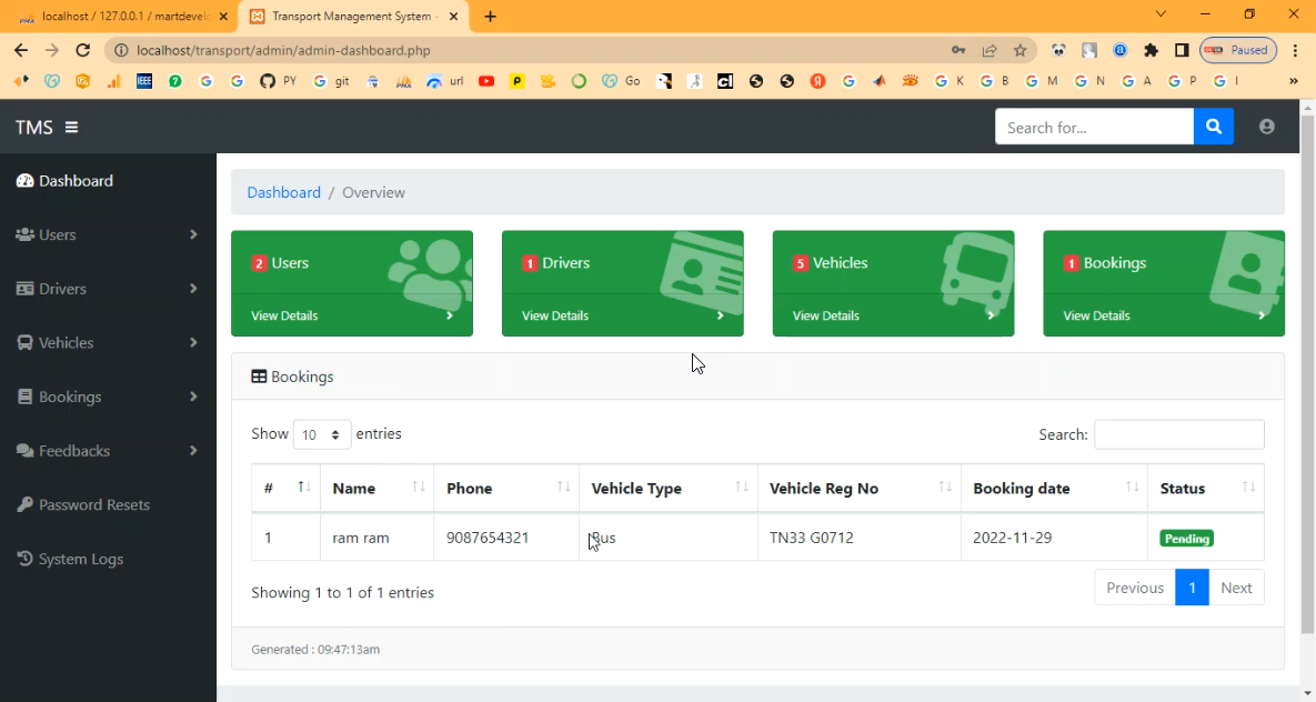 The Transport Management System is a PHP–MySQL based web application designed to manage and streamline transport operations for organizations, schools, or logistics companies. The system allows administrators to manage vehicles, drivers, routes, schedules, and trip assignments efficiently. Users can track vehicle availability, monitor trips, and generate reports on transport usage. By automating transport management, the system reduces manual errors, improves efficiency, and ensures better coordination between transport staff and management.
